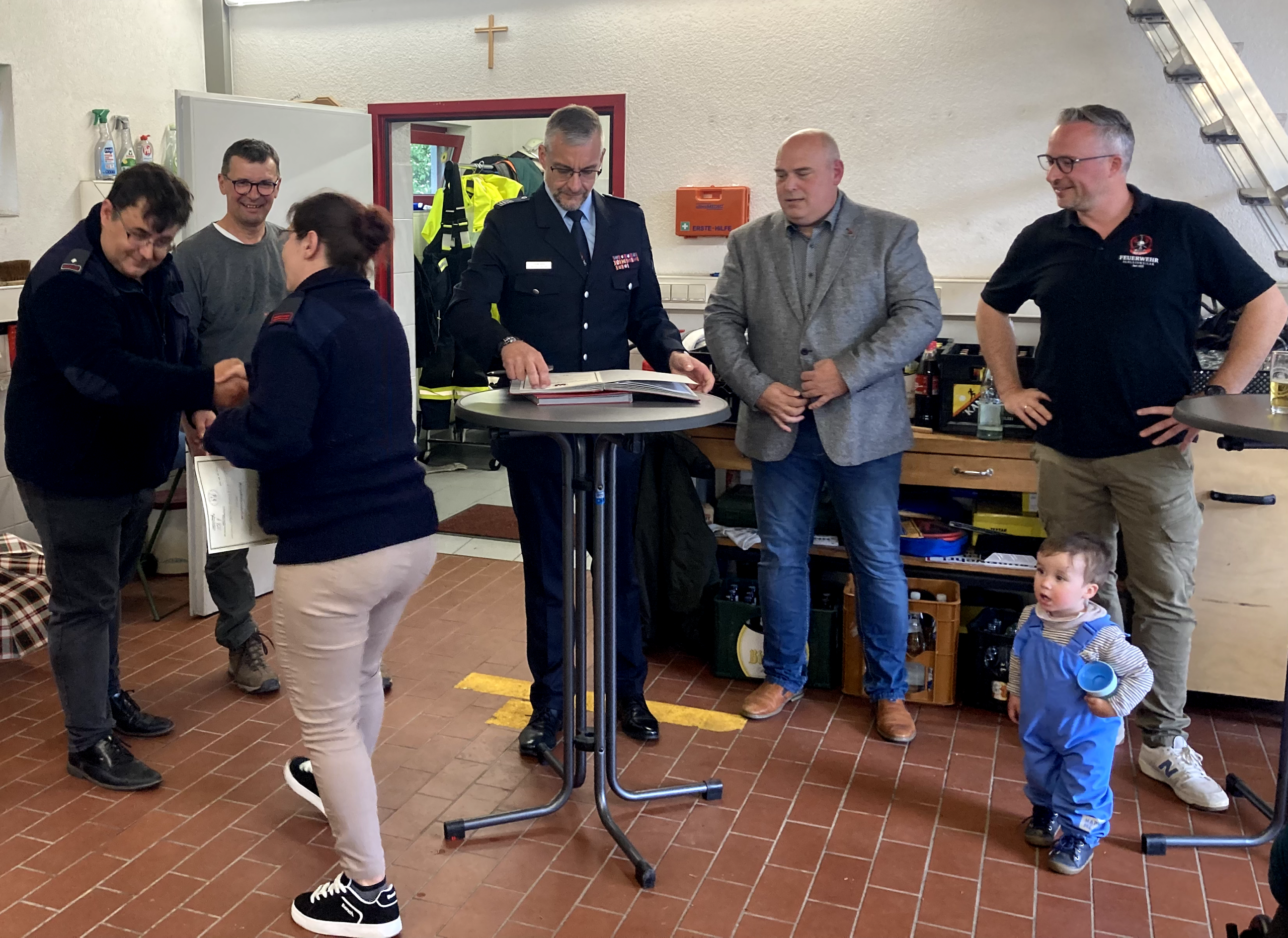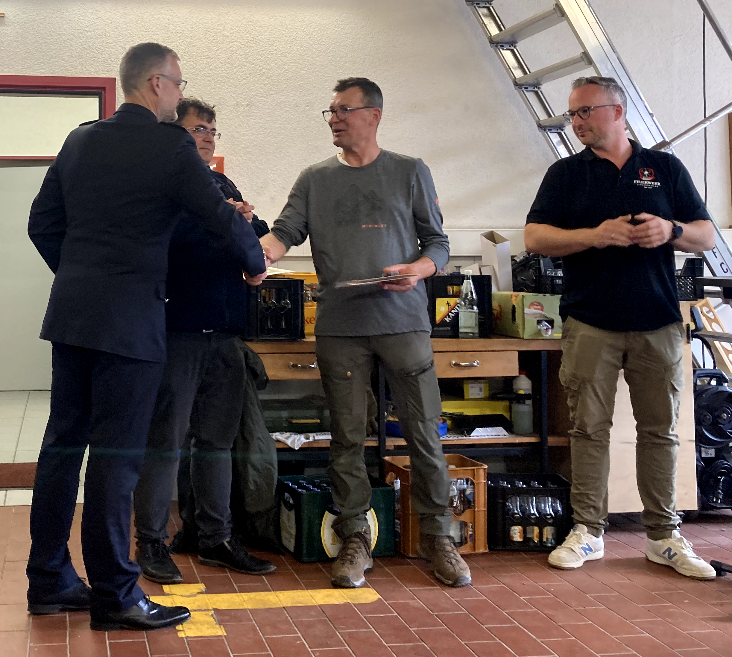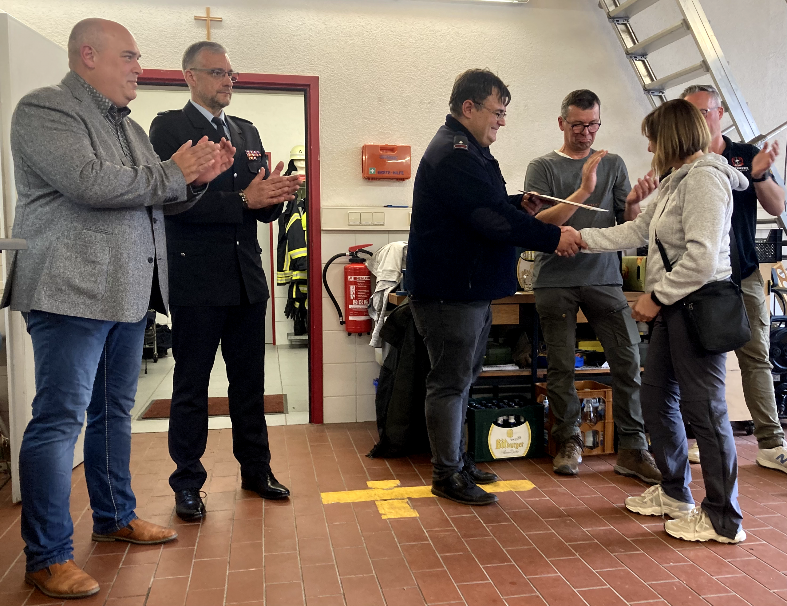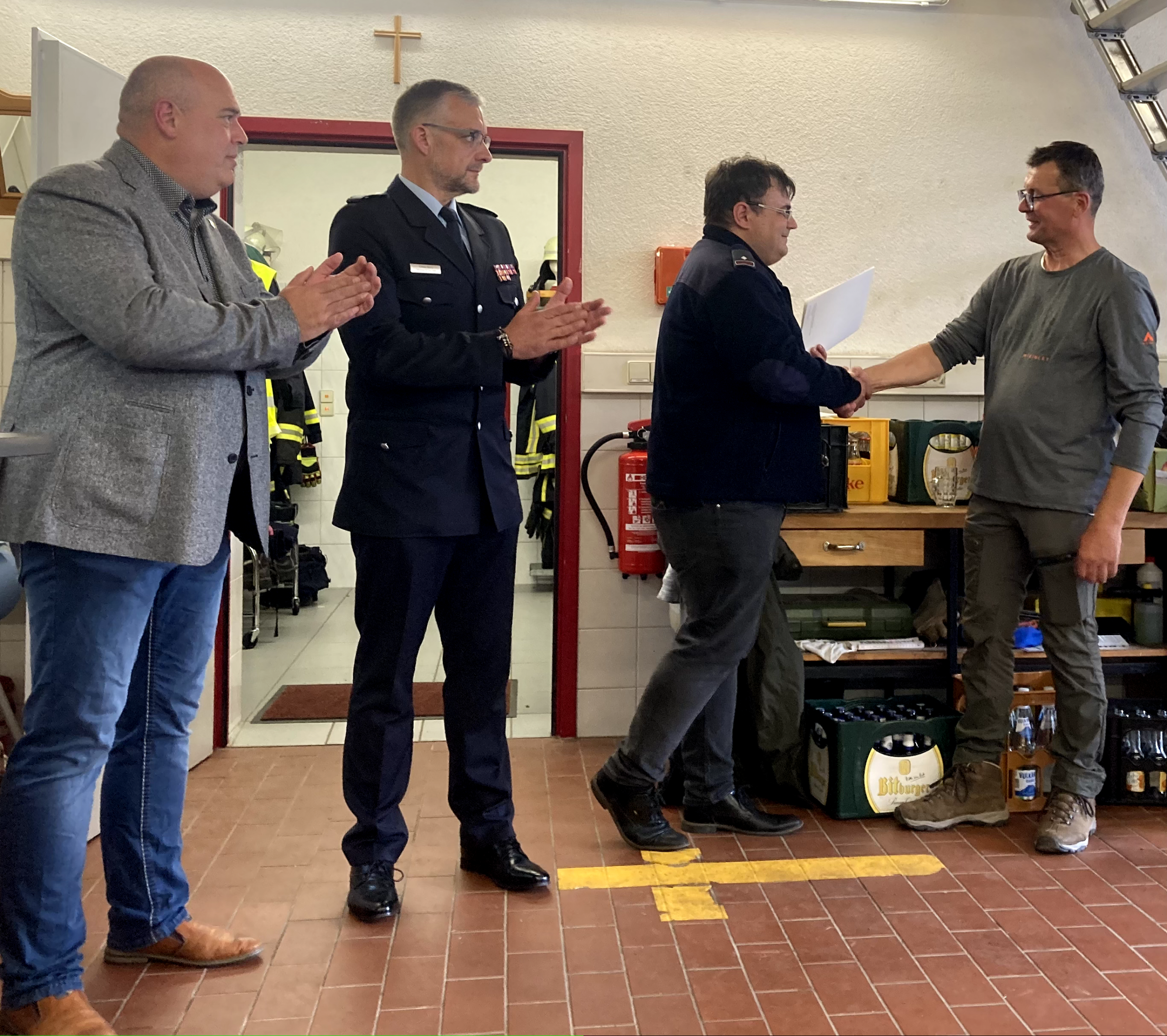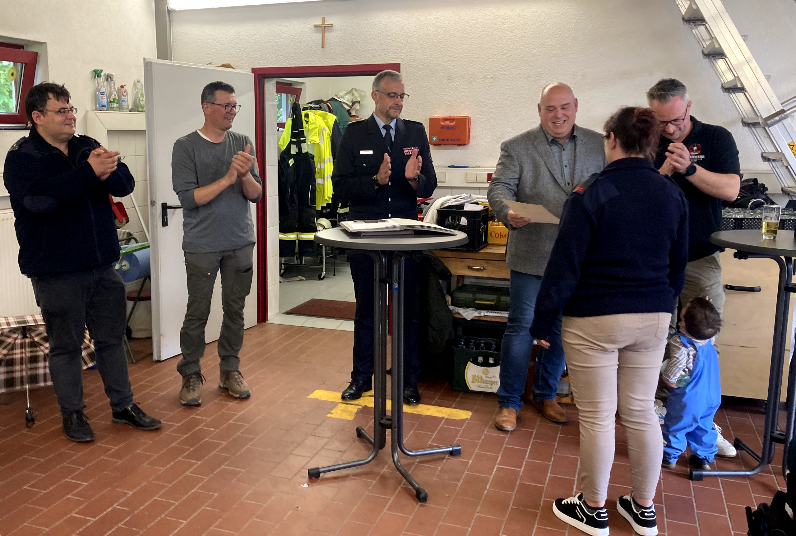 Im Anschluss traf man sich im Gerätehaus, wo in einem feierlichen Rahmen mehrere Beförderungen und Ehrungen durchgeführt wurden. Damit wurde das Engagement und die langjährige Mitarbeit verschiedener Kameradinnen und Kameraden gewürdigt.